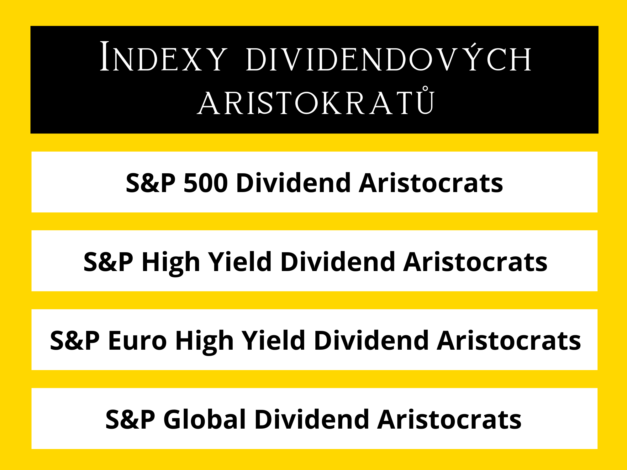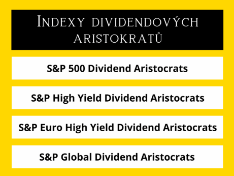 A nebo index S&P Global Dividend Aristocrats, který kombinuje americké, evropské a asijské firmy, které vyplácí a navyšují dividendy také minimálně 10 let.